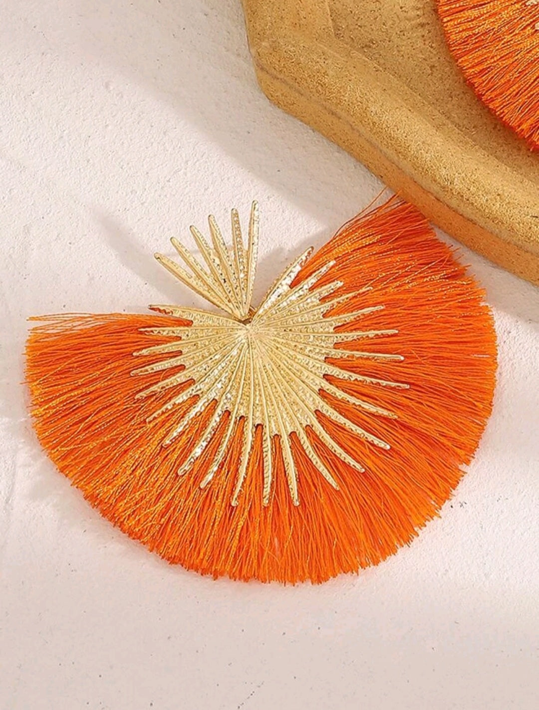 Introducing our Orange and Gold Feather Heart-Shaped Fan Tassel Earrings – where bohemian flair meets romantic elegance in a captivating display of style! These earrings feature intricately crafted heart-shaped fans adorned with vibrant orange feathers, exuding a whimsical and free-spirited charm. The shimmering gold-tone accents add a touch of glamour and sophistication, ensuring these earrings are as eye-catching as they are stylish. With their lightweight design and playful movement, these earrings are the perfect accessory to add a pop of color and personality to any outfit. Made with Stainless Steel. Whether you're dancing at a music festival or attending a summer soiree, these earrings are sure to make a statement and turn heads wherever you go. Embrace your love for eclectic fashion and let your style soar with our Orange and Gold Feather Heart-Shaped Fan Tassel Earrings – because true beauty is found in the details! 🧡✨